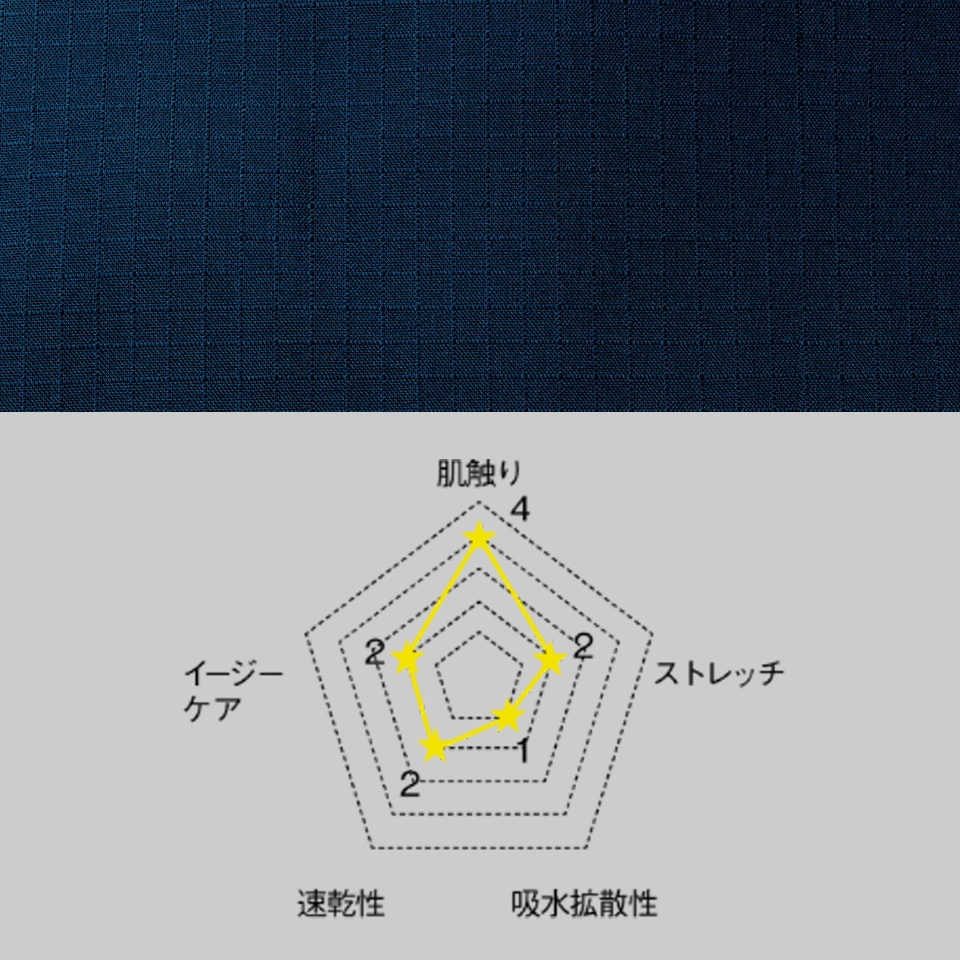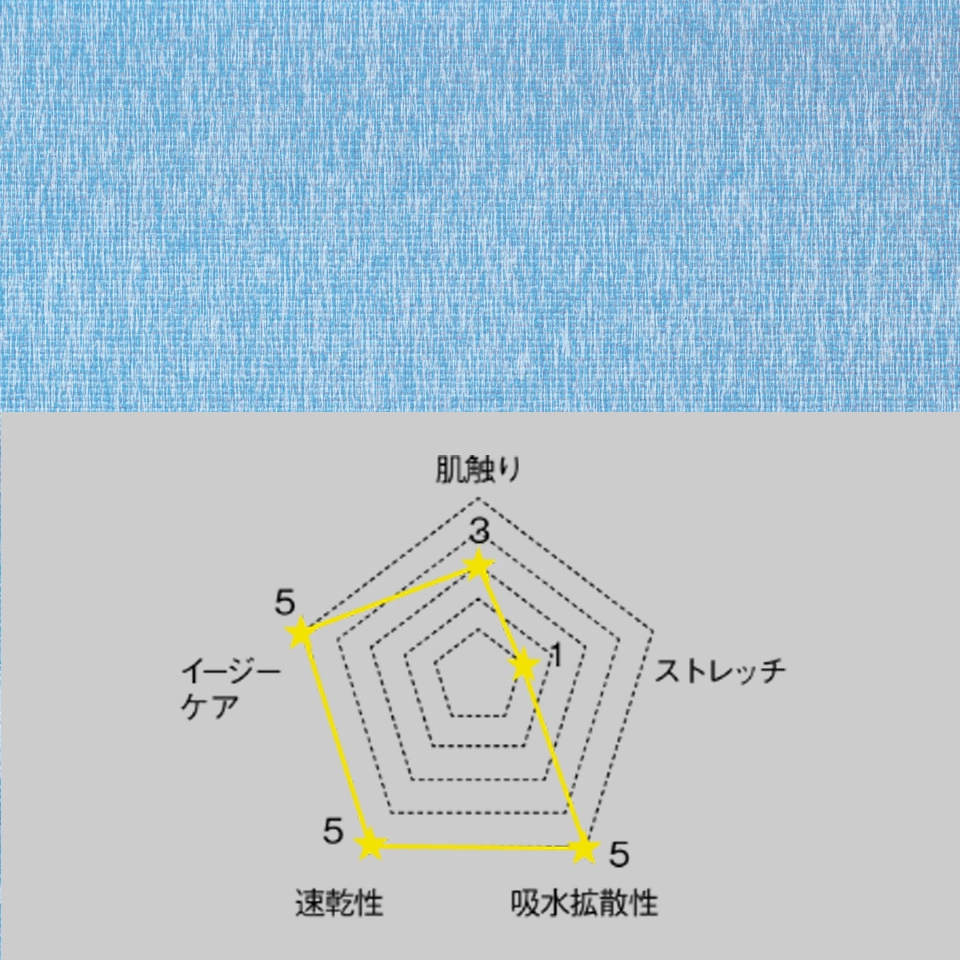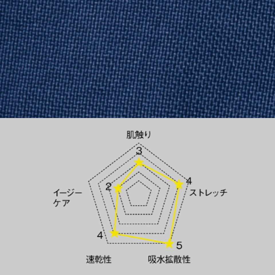 洗濯性に非常に優れた新開発のシャンブレー調素材。SR加工された生地を使用しており、吸汗速乾性・ストレッチ性に非常に優れ、汚れが落ちやすくイージケア性に優れた素材です。何度も洗濯をしても効果が持続するのが大きな特徴の素材です。