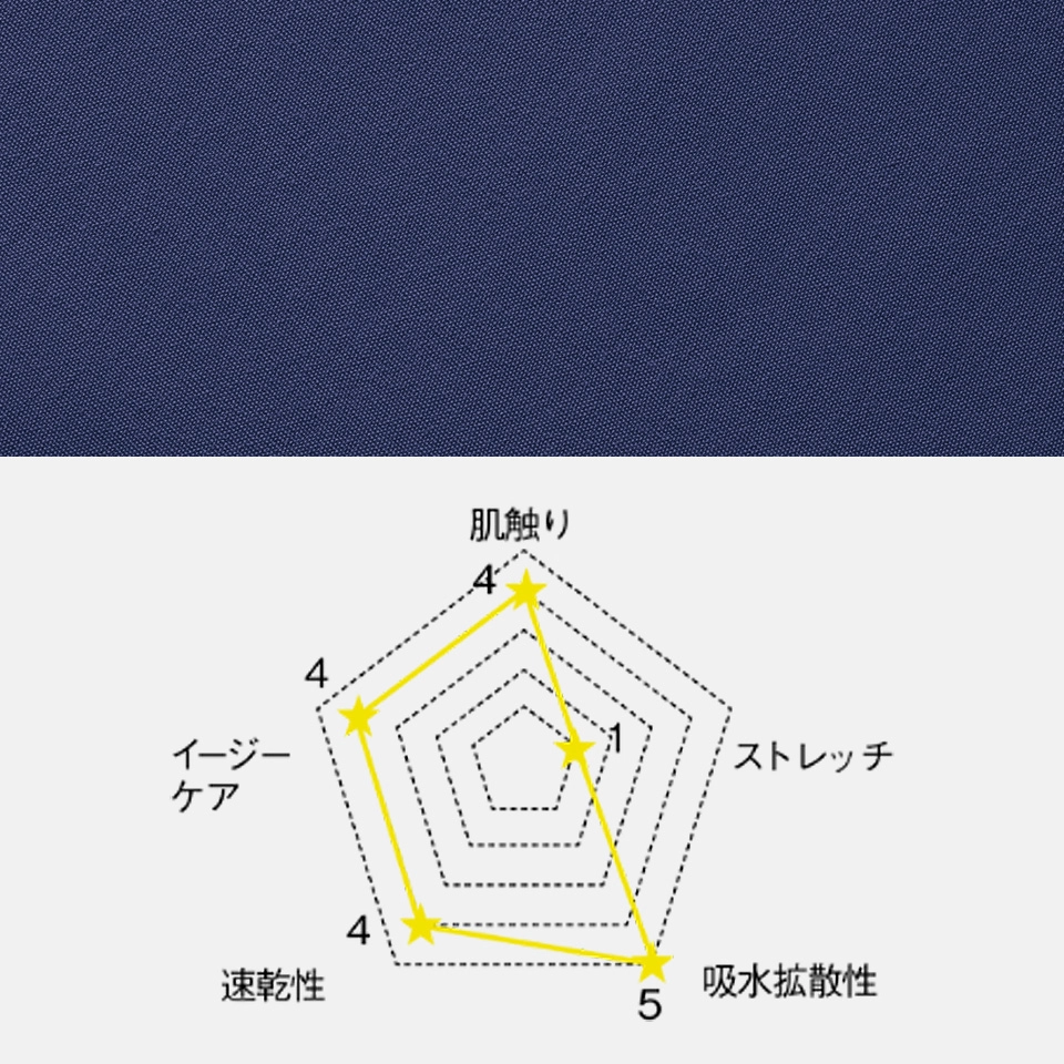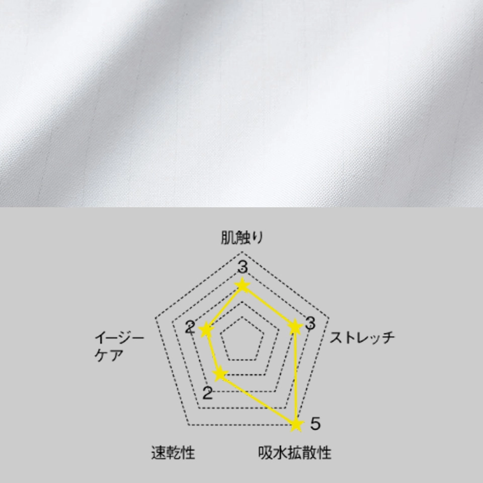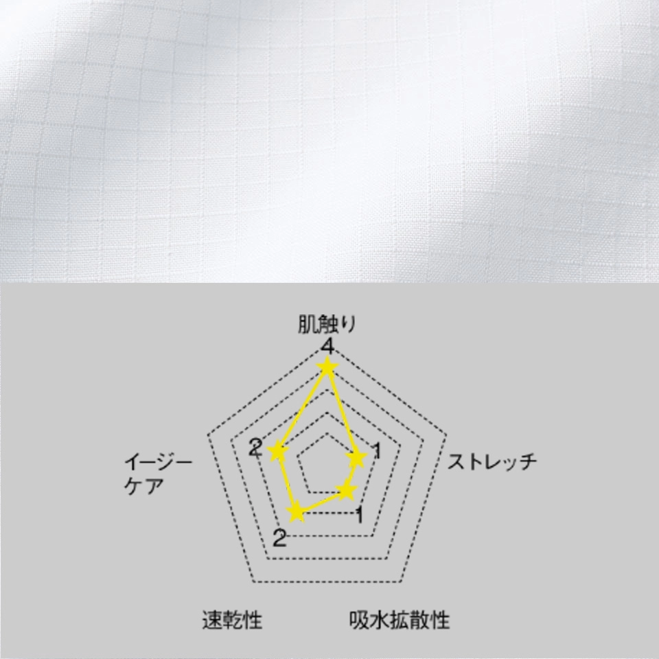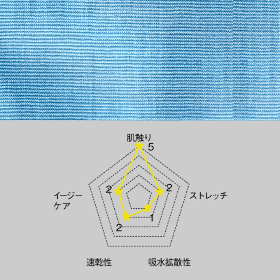 洗濯性に非常に優れた新開発のシャンブレー調素材。SR加工された生地を使用しており、吸汗速乾性・ストレッチ性に非常に優れ、汚れが落ちやすくイージケア性に優れた素材です。何度も洗濯をしても効果が持続するのが大きな特徴の素材です。
