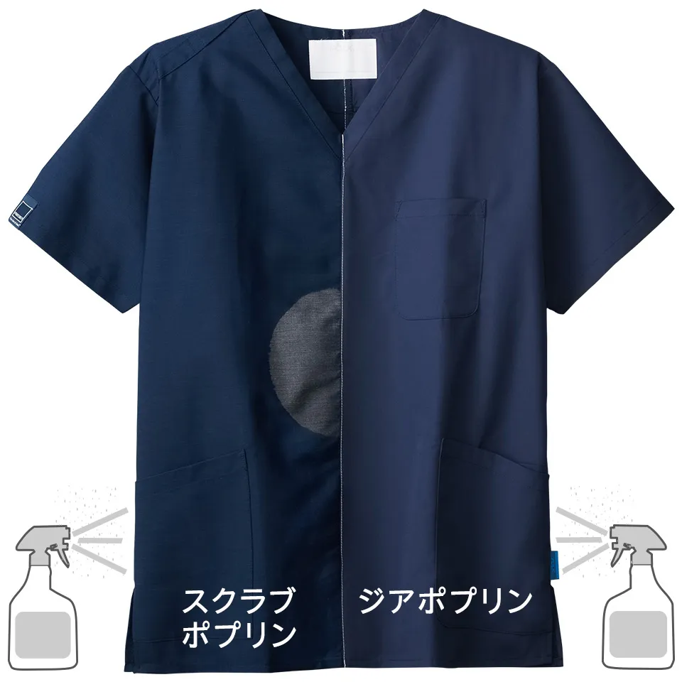 スクラブポプリン(左身頃)とジアポプリン(右身頃)で作ったスクラブに次亜塩素酸ナトリウム溶液(濃度6%)をかけたところ、ジアポプリンはほぼ色落ちしていません。