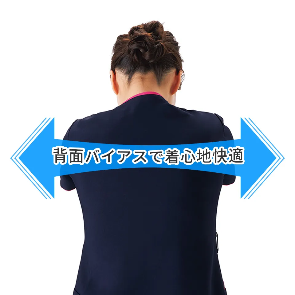 背面部分に斜めに生地をとることにより、自然な伸縮性が生まれ、動きやすく着心地もより快適に。