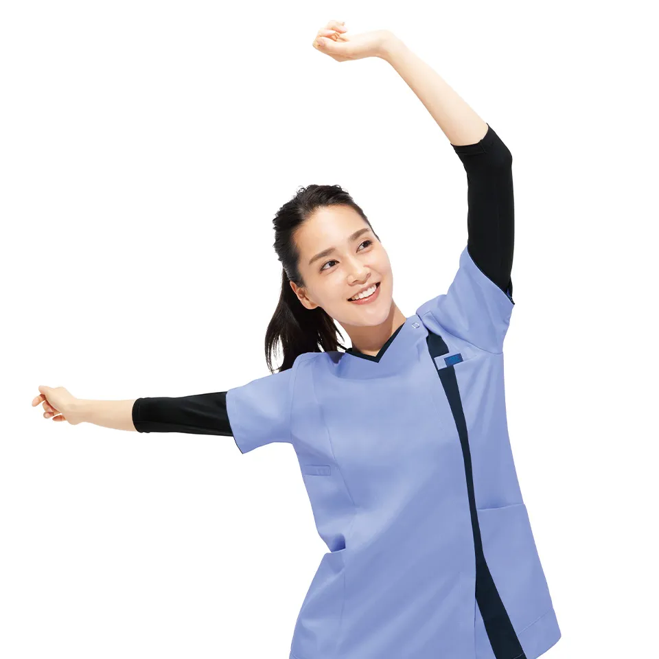 独自に考案した機構で実現した、かぶらずに羽織って着られるスクラブ。 スピーディに脱ぎ着できるだけでなく、着脱時に化粧や髪が乱れるのを防ぎます。