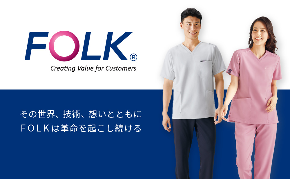 FOLKはその名の由来である「親しみ」を大切に、医療業界に寄り添いつつ、 刻々と変化していく現代で立ち止まることなく、常に新しい時代のためのユニフォームを開発しています。