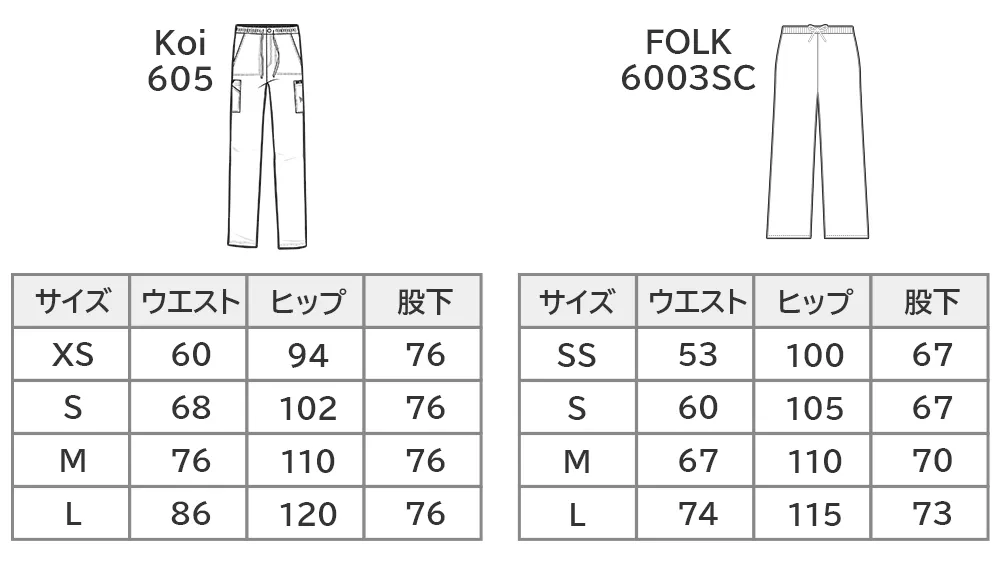 一般的な日本サイズFOLK 7000SCスクラブ(男女兼用)と比べるとKoiの668ブライアンメンズトップ(メンズスクラブ)は着丈が長めに作られています。