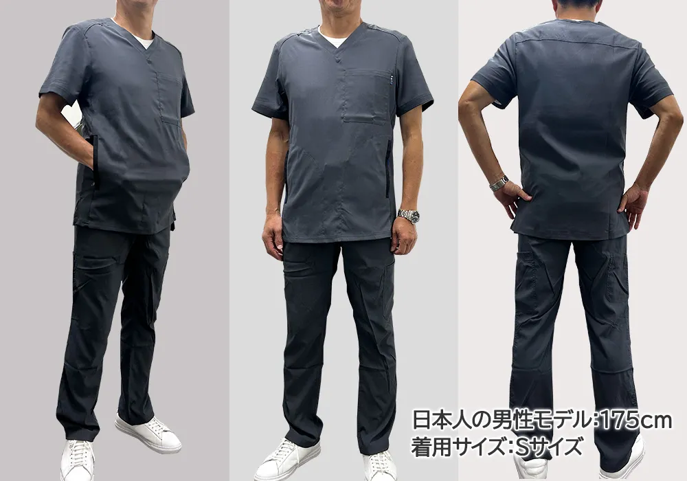 日本人の男性モデルには667スクラブ(メンズ)を着てもらいました。下は半袖のTシャツを着用しています。普段のTシャツサイズはMサイズを着用しておりますが、一回り小さいSサイズがぴったりでした。