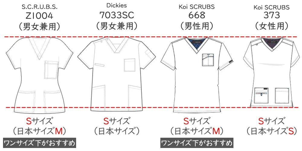 定番のアメリカンスクラブとKoiのスクラブでサイズ比較をいたしました。男女ともに人気のディッキーズシリーズのスクラブ(男女兼用)は日本サイズで作られており、7033SCスクラブは、7000SCスクラブと同様のサイズスペックとなっております。