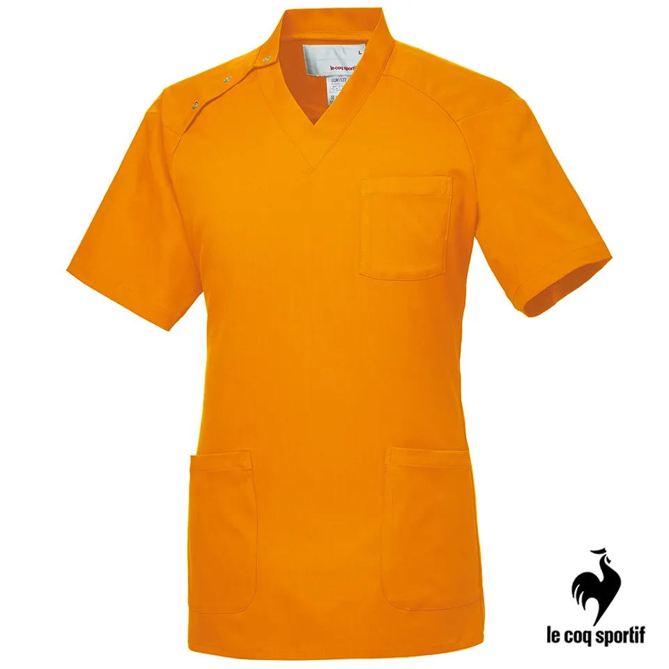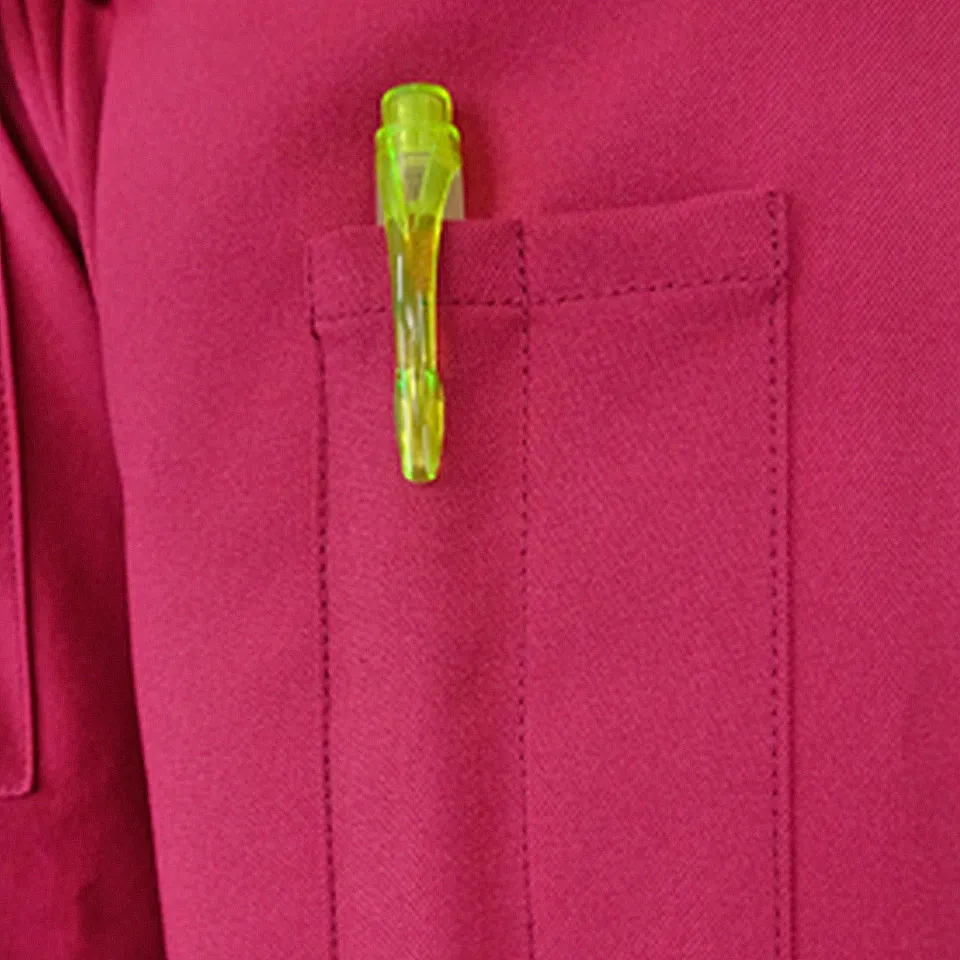 男女兼用Vネック ストレッチ スクラブで着崩れしにくく、ハリがありながらストレッチが効いています。ネックストラップが首にかかりにくくなるタブ付きで首回りスッキリ、収納性もバッチリです。