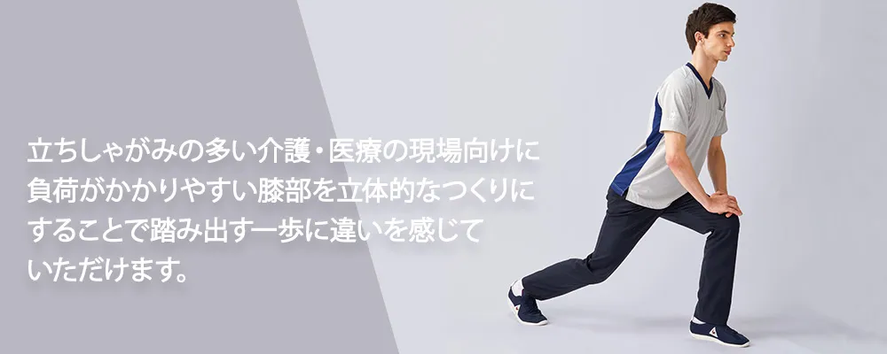 しゃがんだり立ったりと脚腰への負担が多い看護・介護の現場をサポート。引きつりや衣服のもたつきを軽減するデザイン。