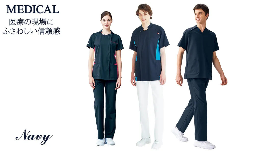 ネイビーはどんな方にも合うすぐれモノ。ホワイトとブルーと相性がよく、医療の現場にぴったり合います。