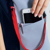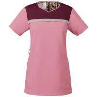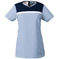 右脇に便利なループと小分けポケットがあり、サージカルテープやはさみ・小物類の収納にとても便利です。左胸にポケットが付きます。フェミニンな花柄の裏地がとてもきれいで、動いた時にちらりと見えるかわいいデザイン。