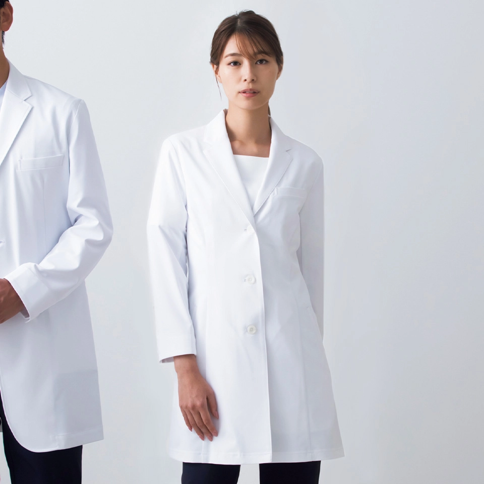美脚効果のある丈感とすっきりスマートな印象。美シルエットの極みのレディス診察衣です。