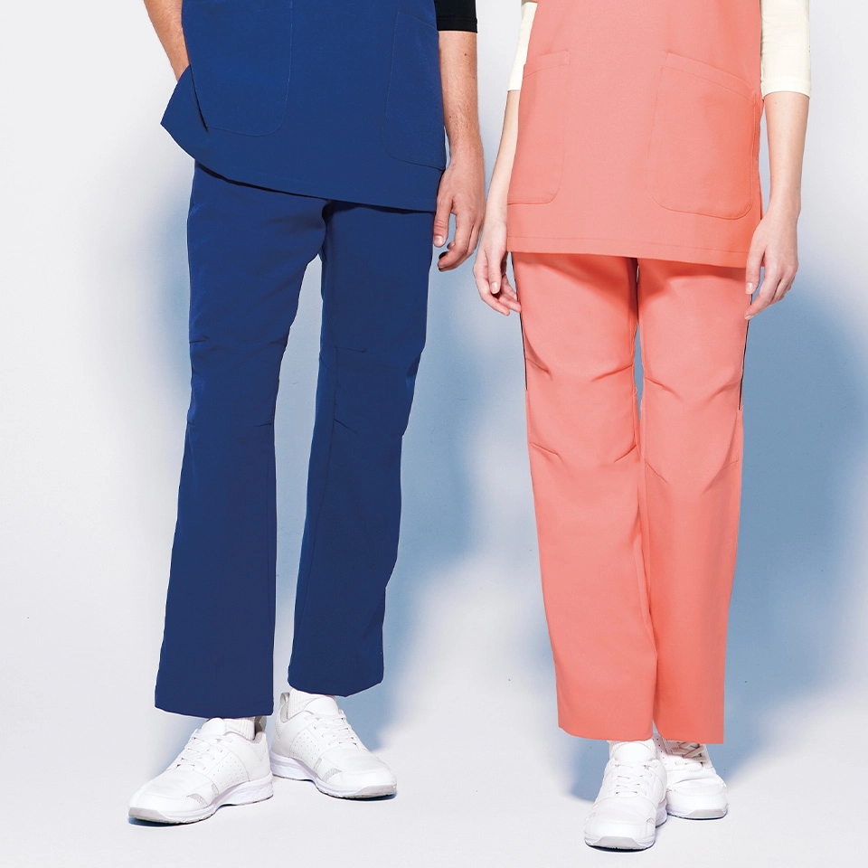 ストレッチ機能と膝のダーツでスムーズに動けるスクラブパンツ