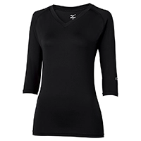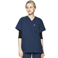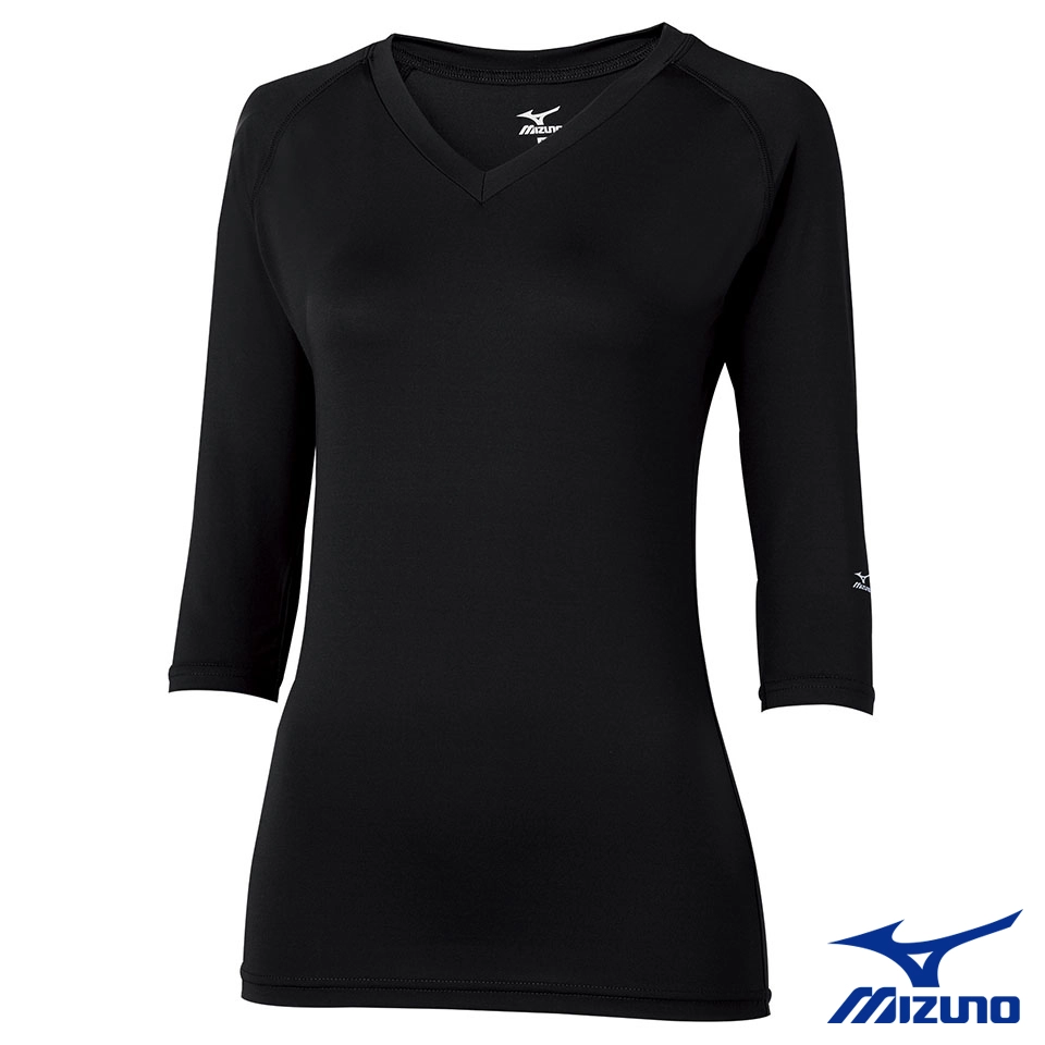 スクラブの襟元から見えることなく着用ができるVネックタイプ。袖にはMIZUNOロゴピスネーム付き。