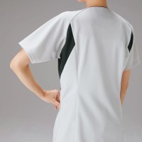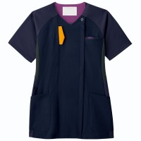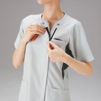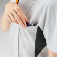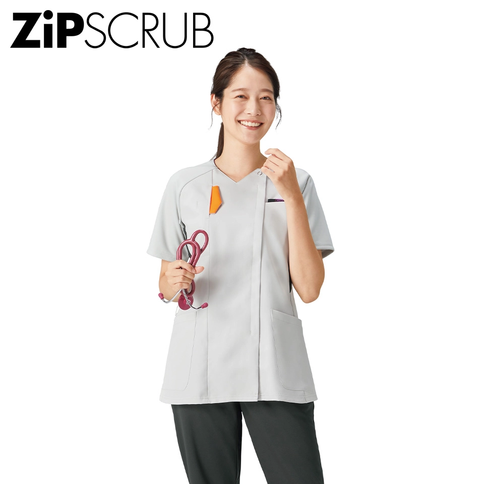 胸元の見えにくい襟ぐりやボディラインをすっきり見せるカラーの切り替えなど、女性に嬉しいデザインのジップスクラブ。