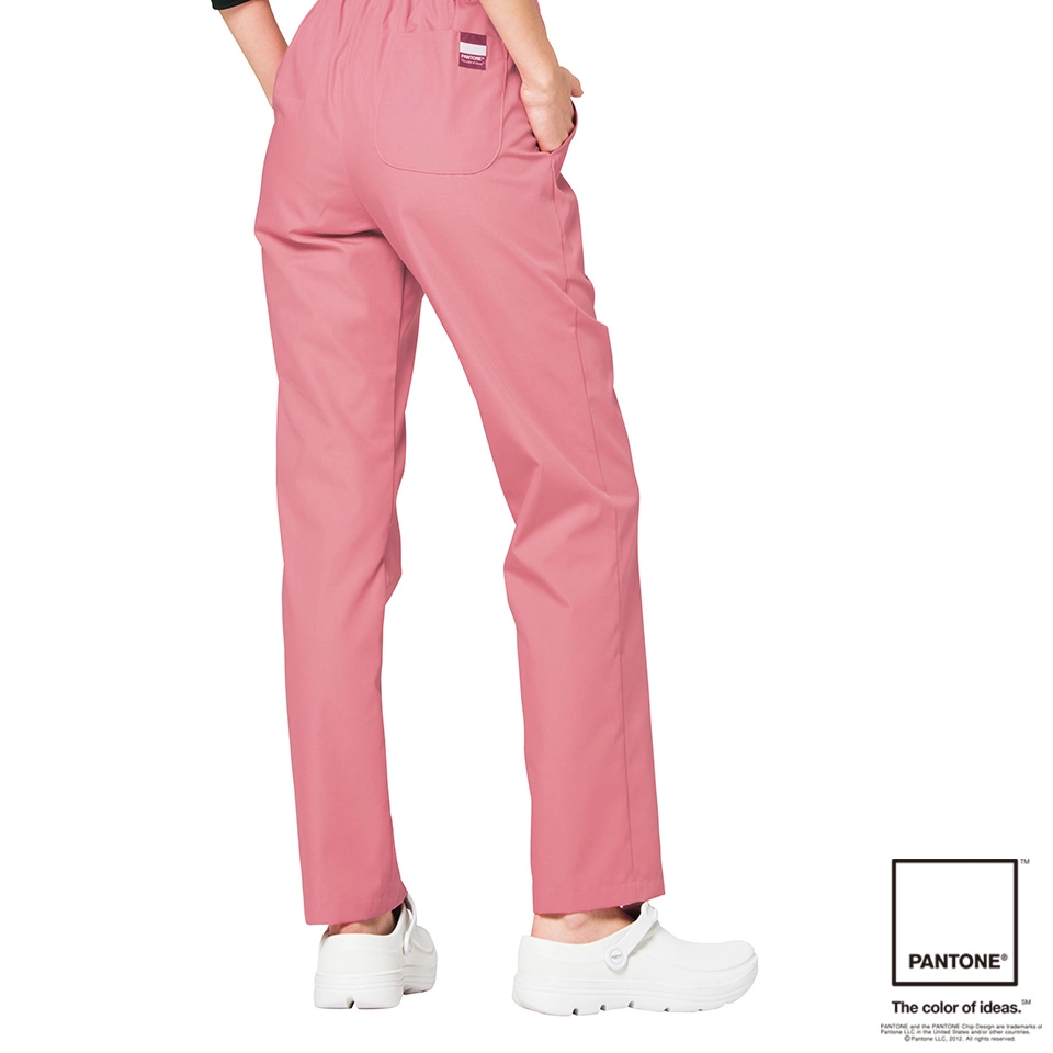 履き心地、楽々のウエストゴム仕様。 スリムなシルエットなのに動きやすい!後ろポケットにPANTONEのカラフルなピスネーム付き、スクラブやドクターコートと合わせるのもおすすめです。