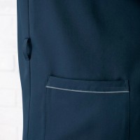 襟元とポケット口に施したパイピングがシックで目を惹くデザイン。胸ポケットの内側にPHSホルダー付き。出し入れしやすいよう傾斜をつけています。右腰にはキーチェーンなどをとめるのに便利なループ付き。軽量でナチュラルストレッチの自然なフィット感あり。