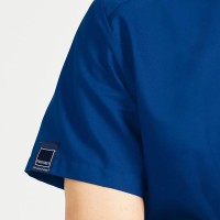 落下防止テープ付胸箱ポケット付き、生地感は硬めでストレッチ性はありません。タンガリーシャツのような肌触りの男女兼用スクラブです。