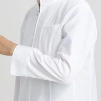 適度なストレッチ性がありファスナーを閉めたままでも腕の上下・前後運動に伴う突っ張り感がありません。衿先までジップアップできるため、スタンドカラーにしても着用可能。折り返しやたくし上げが可能なスリット入りの袖口。生地は綿混紡素材ならではの着心地と防シワ性が特長。