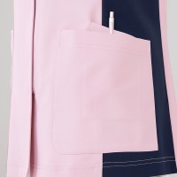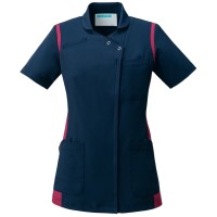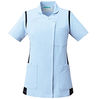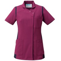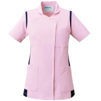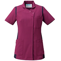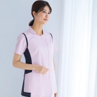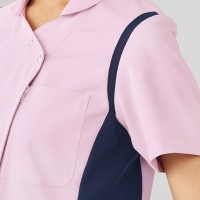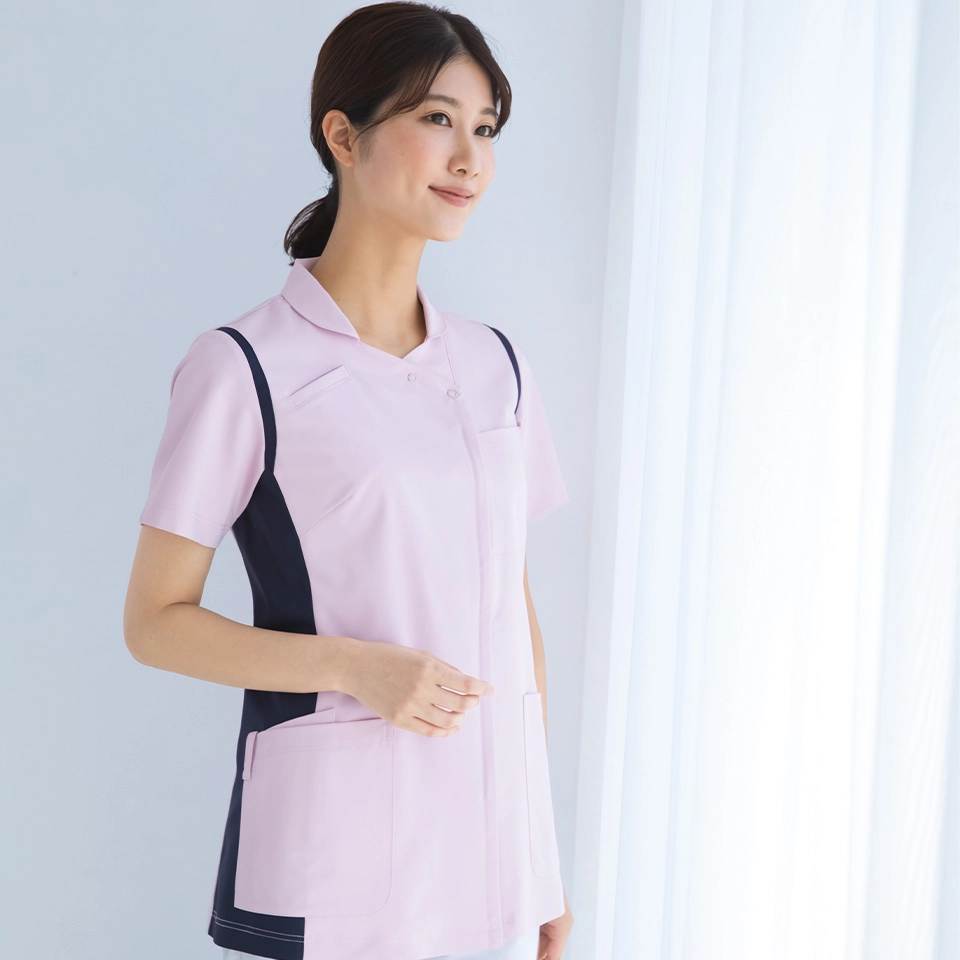 スマートに着こなせる衿付レディススクラブ。フロントファスナータイプ(比翼ファスナー仕様)なので、かぶらずに着られてファンデーションなどの化粧付着を防げます。