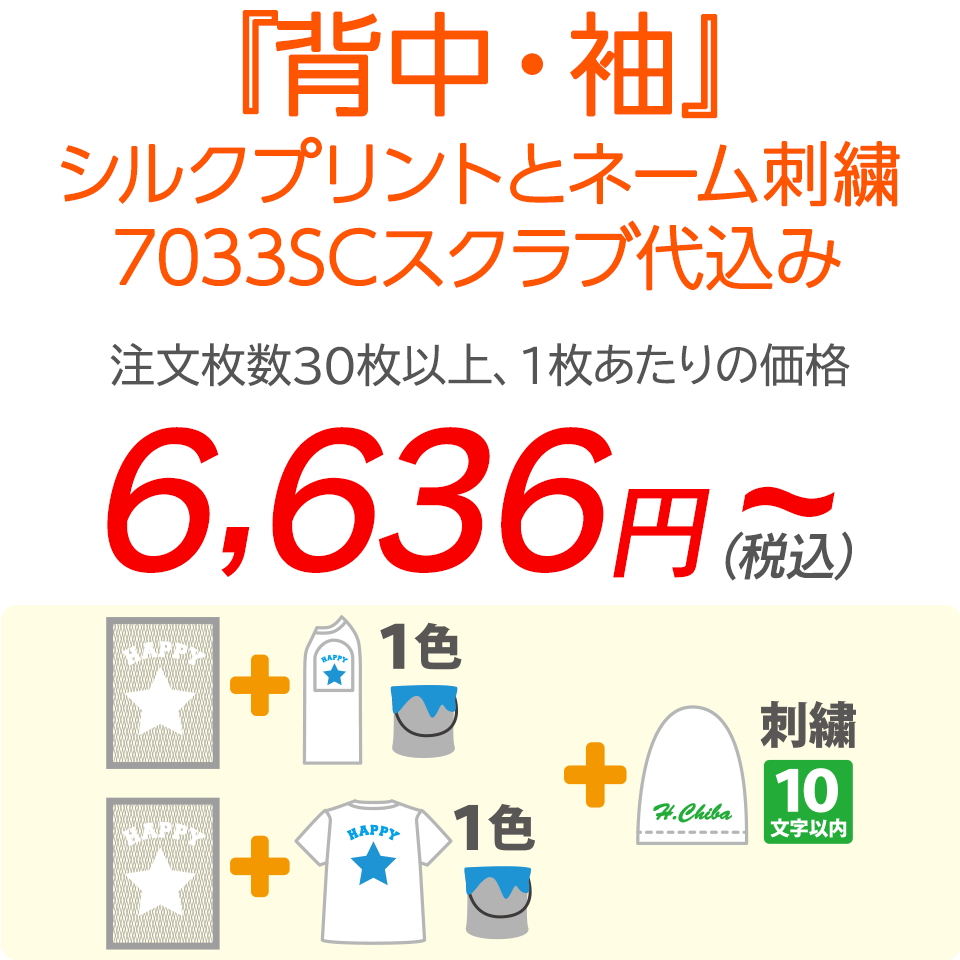 アルファユニでよく選ばれている7033SCスクラブにプリント2カ所とネーム刺繍を入れたチームスクラブ。