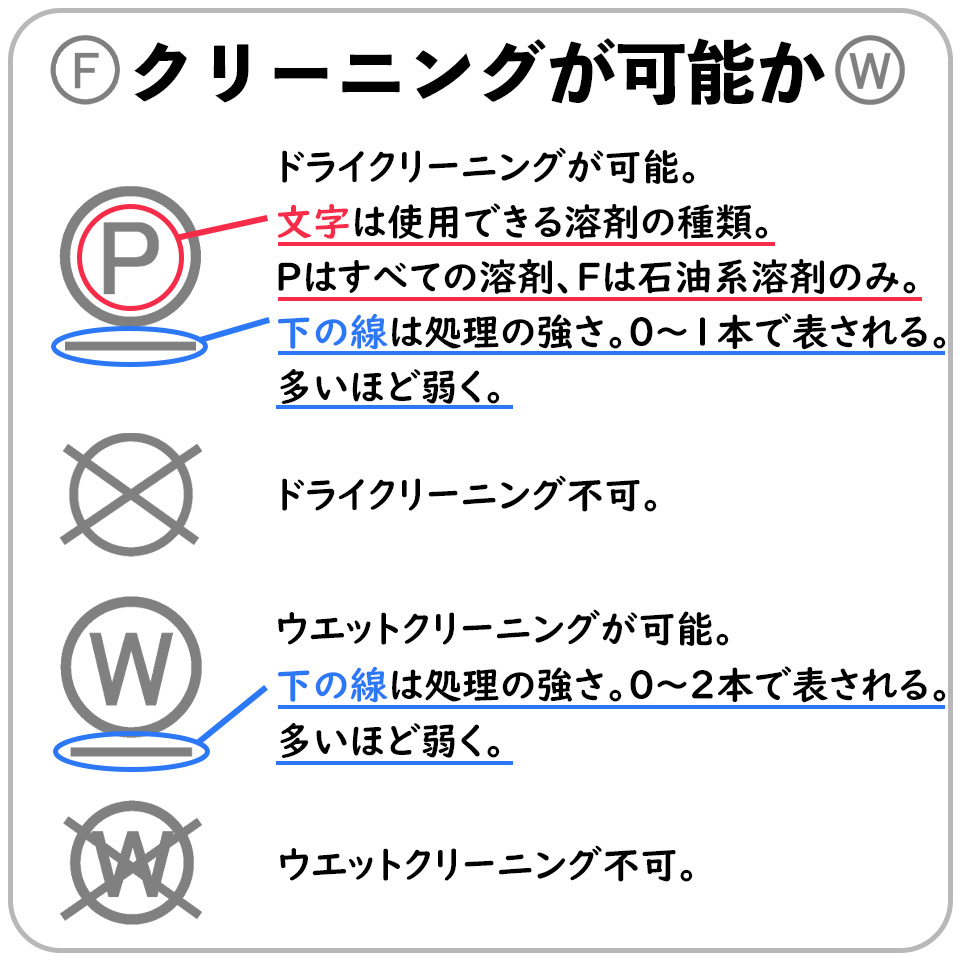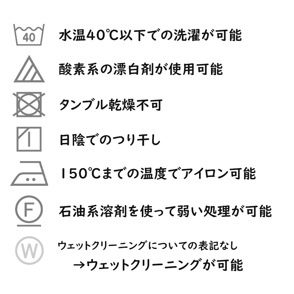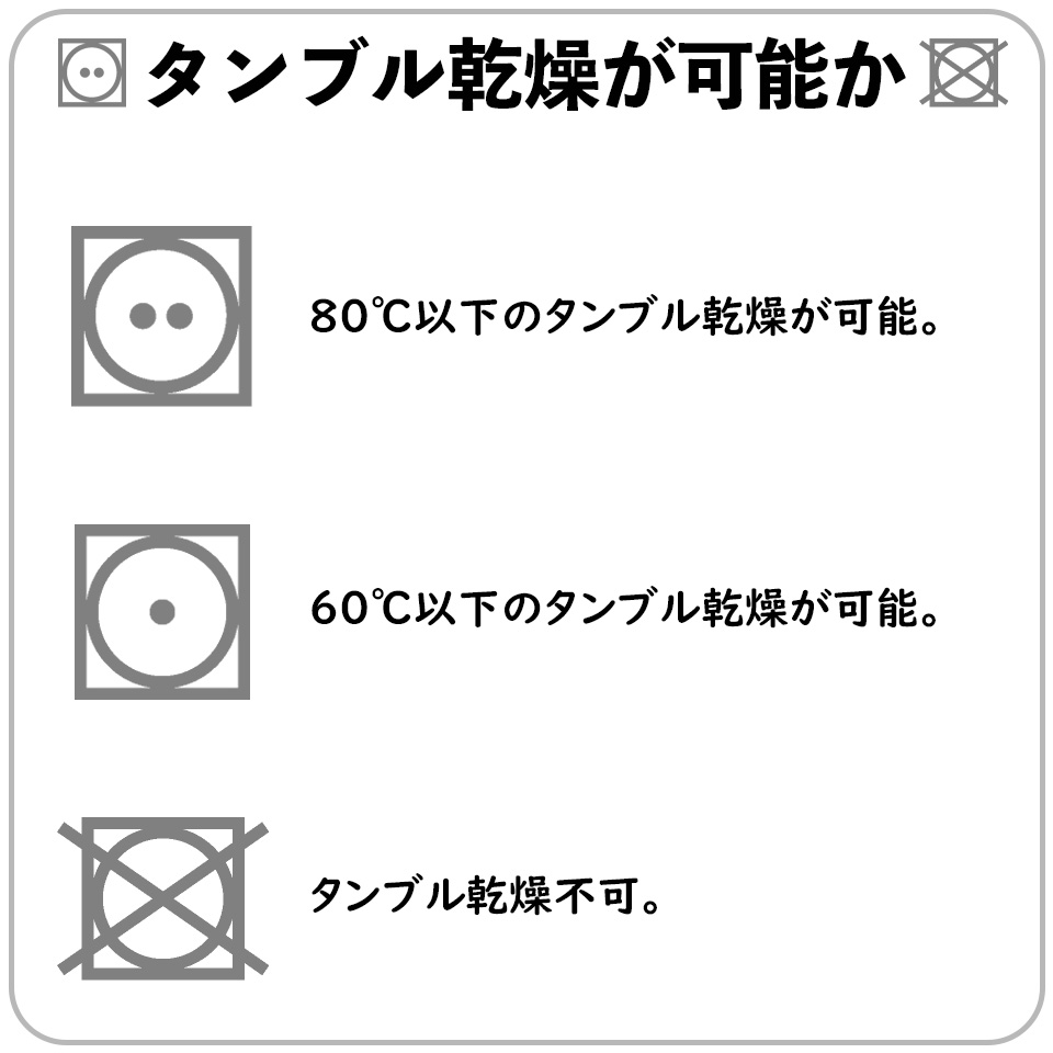 「洗濯が可能か」「漂白剤が使えるか」以外の表示は省略されることがあります。その場合は、タンブル乾燥なら80℃以下、アイロンなら200℃までというように一番高い条件での処理が可能です。