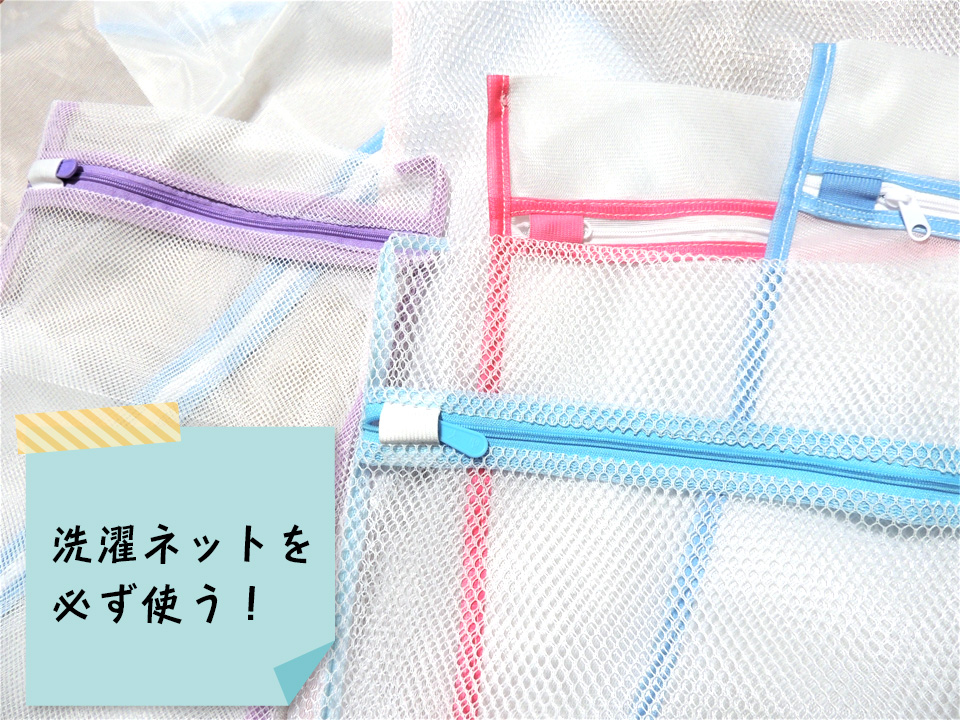 洗濯機で洗うときは洗濯ネットに入れると◎!刺繍が他の洗濯物や洗濯機内部とぶつかるのを防いで劣化を抑えます。