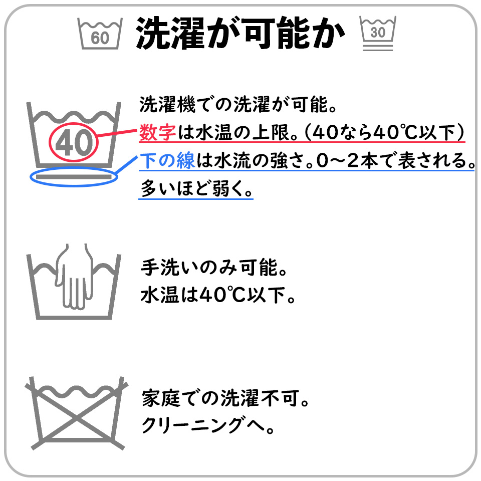 “洗濯表示を覚えるのは大変…”と思われがちですが、数字や記号の意味がわかると意外と難しくないんです!下記の図でチェックしてみましょう!