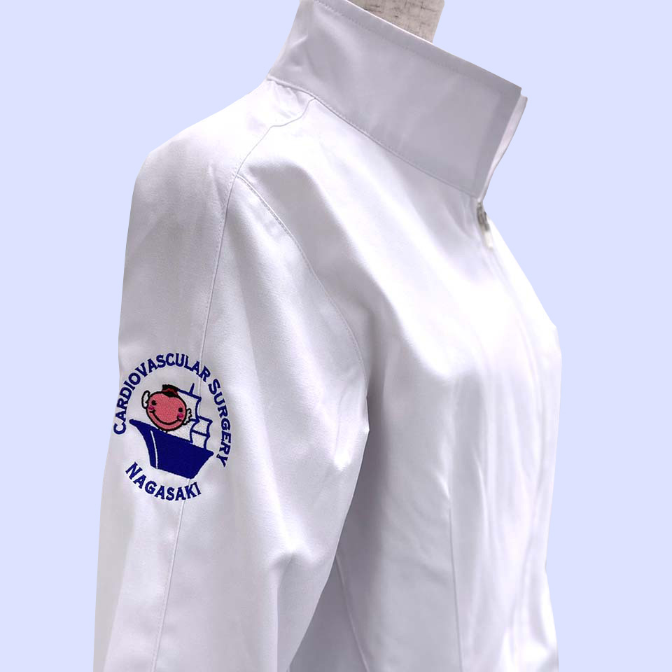 刺繍加工であれば、どのようなクリーニング方法にも対応!白衣の生地に直接糸を縫いつけるため、プリントのように剥がれたり割れてしまうこともありません。耐久性の面でも白衣には刺繍での加工がオススメなんです。