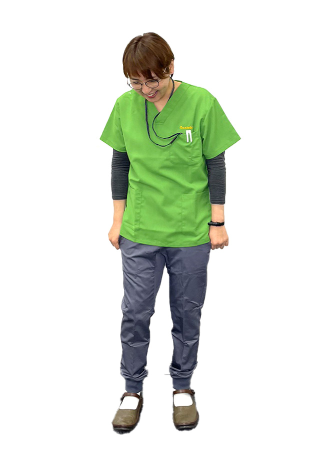 ナチュラルなグリーンのスクラブにイエローのネーム刺繍を入れることによって、落ち着いた中にも明るい印象を与えられると思ったことと、おしゃれに見えることからです!