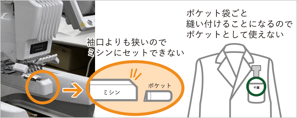 ポケットに刺繍がいれられないか、よく質問をいただきますが、基本的には行っておりません。なぜかというと、既製品に刺繍しますのでポケット袋ごと縫い付けることになります。そのためポケットが使用できなくなるからです。また、ポケット口は狭い為、刺繍枠をはめることができてもミシンにセットすることができません。そのため、ポケット口上に刺繍をおすすめしております。