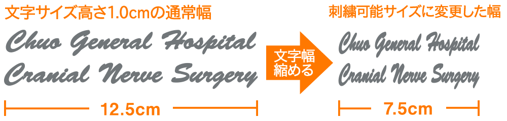 病院や医療機関名、診療科・部門名、個人ネームを通常文字で刺繍すると左胸ポケットの幅より、はみ出してしまいます。そのため、実際刺繍を施す場合は、刺繍可能サイズに文字幅を縮めて調整します。左胸ポケット口上の刺繍可能サイズはW7.5cm、右胸の刺繍可能サイズはW10cmです。文字数が多い場合は、左胸より右胸に入れる事をオススメします。