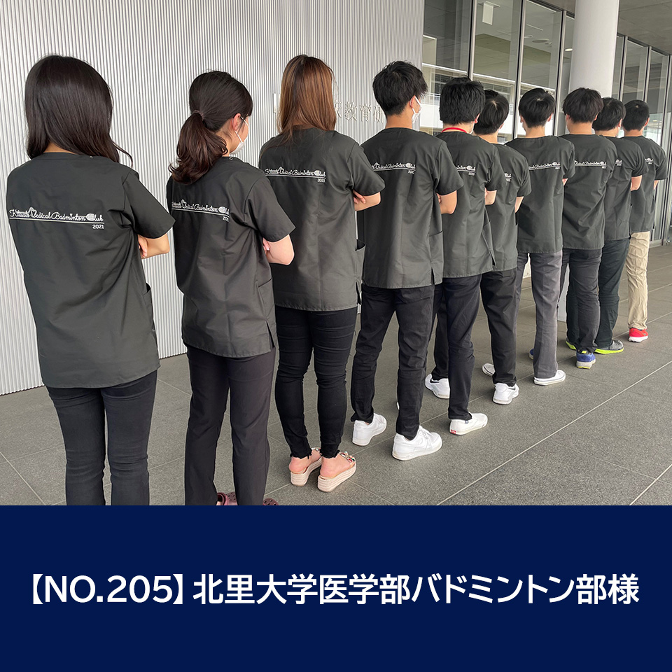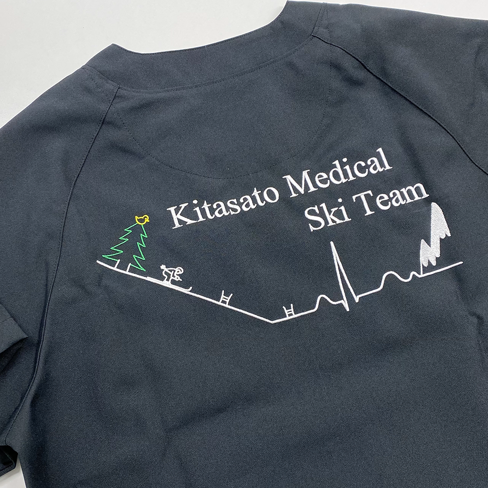 北里大学医学部バドミントン部様のスクラブ。背中のデザイン刺繍が迫力があり素敵!