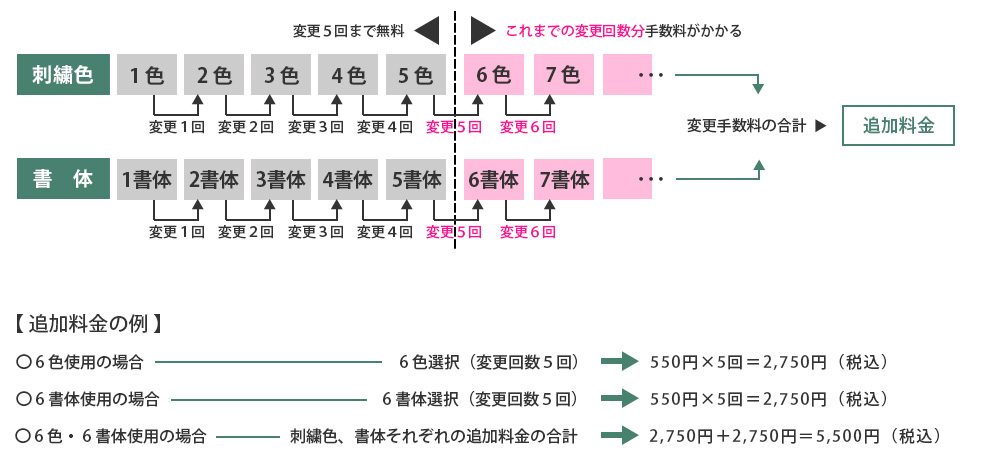 5種類を超える場合は、刺繍色・書体それぞれ変更につき550円(税込)の追加料金(変更手数料)が発生します。