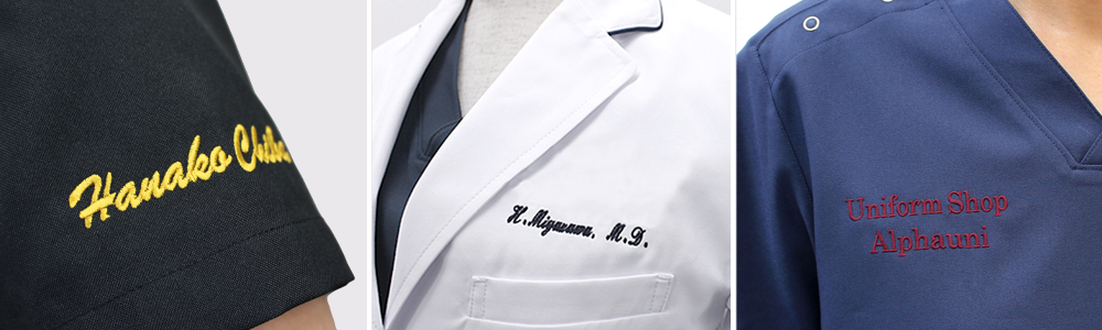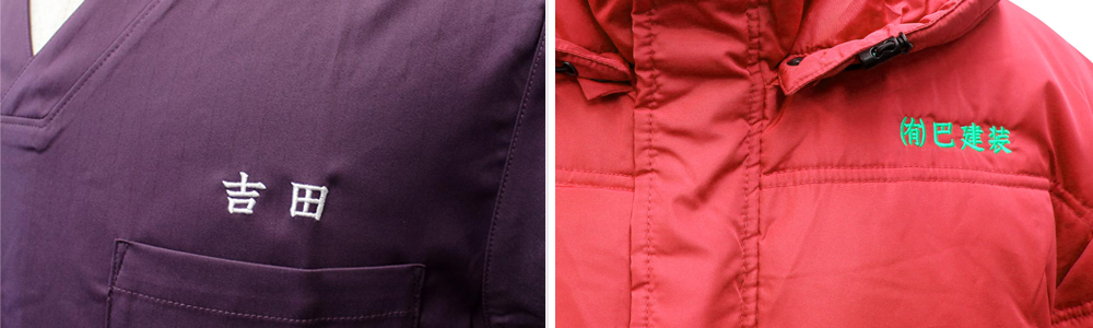 ネーム刺繍・名入れ刺繍に関する加工料金のご案内ページです。文字数によって加工価格が異なります。書体・糸色は弊社のフォント集からお選びください。また、別途1枚につき66円~275円(税込)の仕上げ代がかかります。仕上げ代は商品によって異なります。