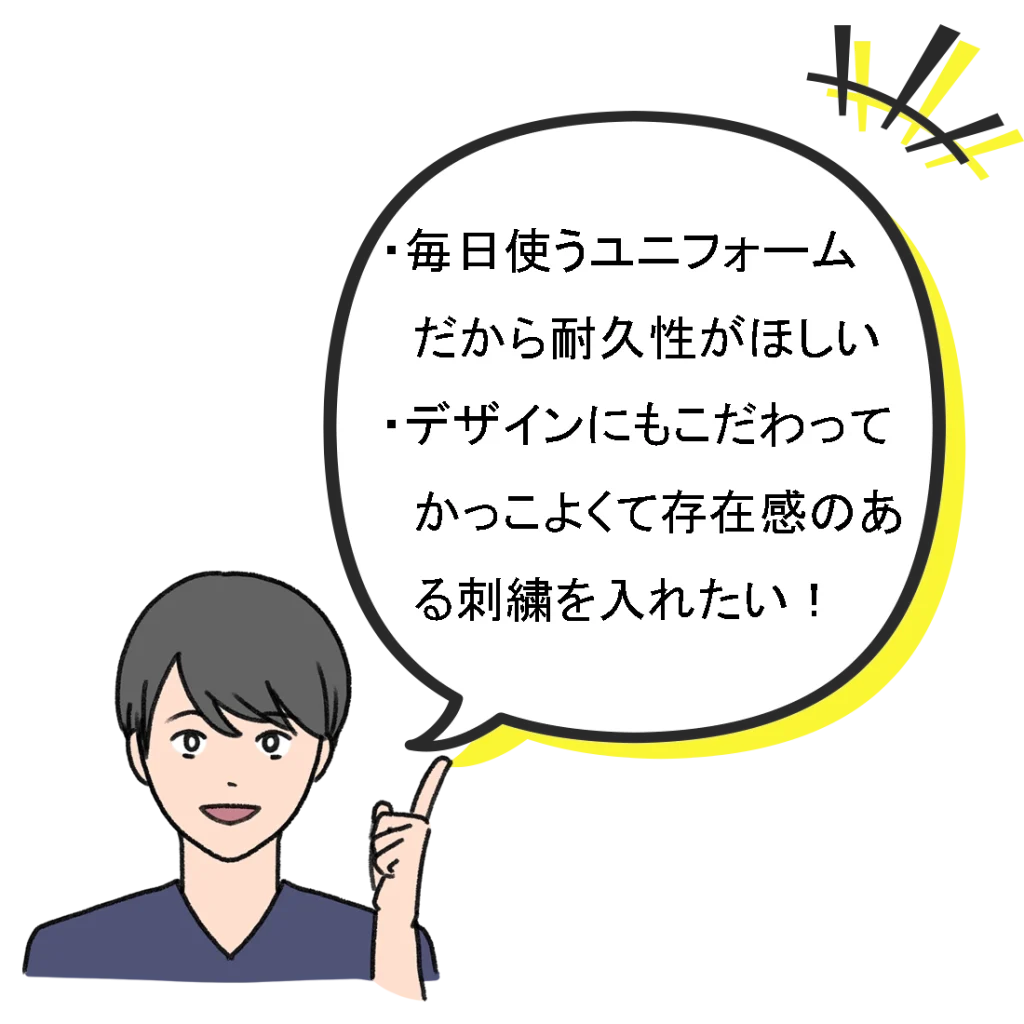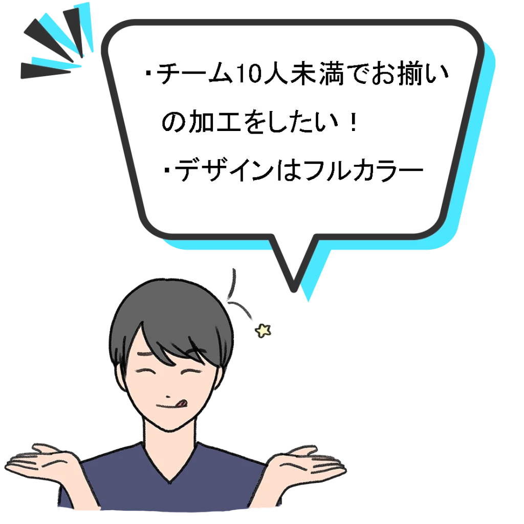 背中に大きなデザインをしたい、袖にロゴマークを入れたいなど、やりたい加工の種類とデザインのざっくりとしたイメージをみんなで決めましょう!