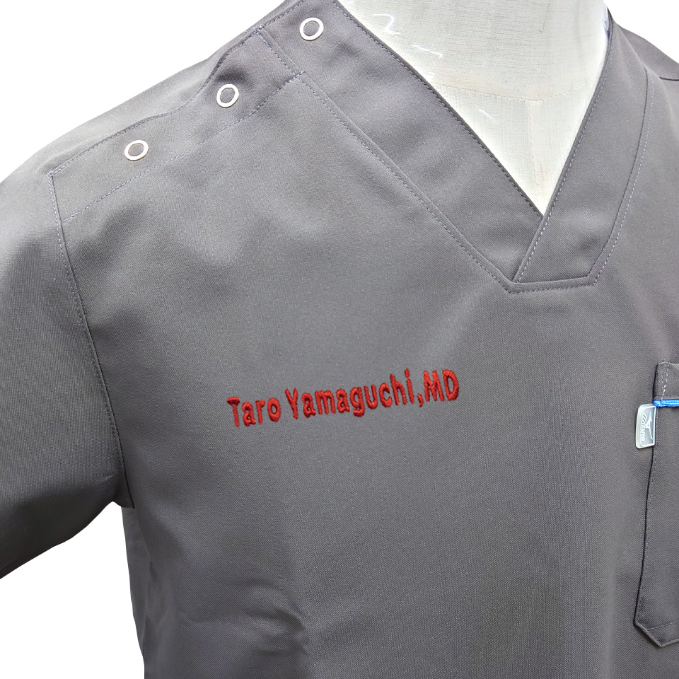アルファユニなら、スクラブ・白衣を綺麗で存在感のあるネーム刺繍を入れることができるんです!