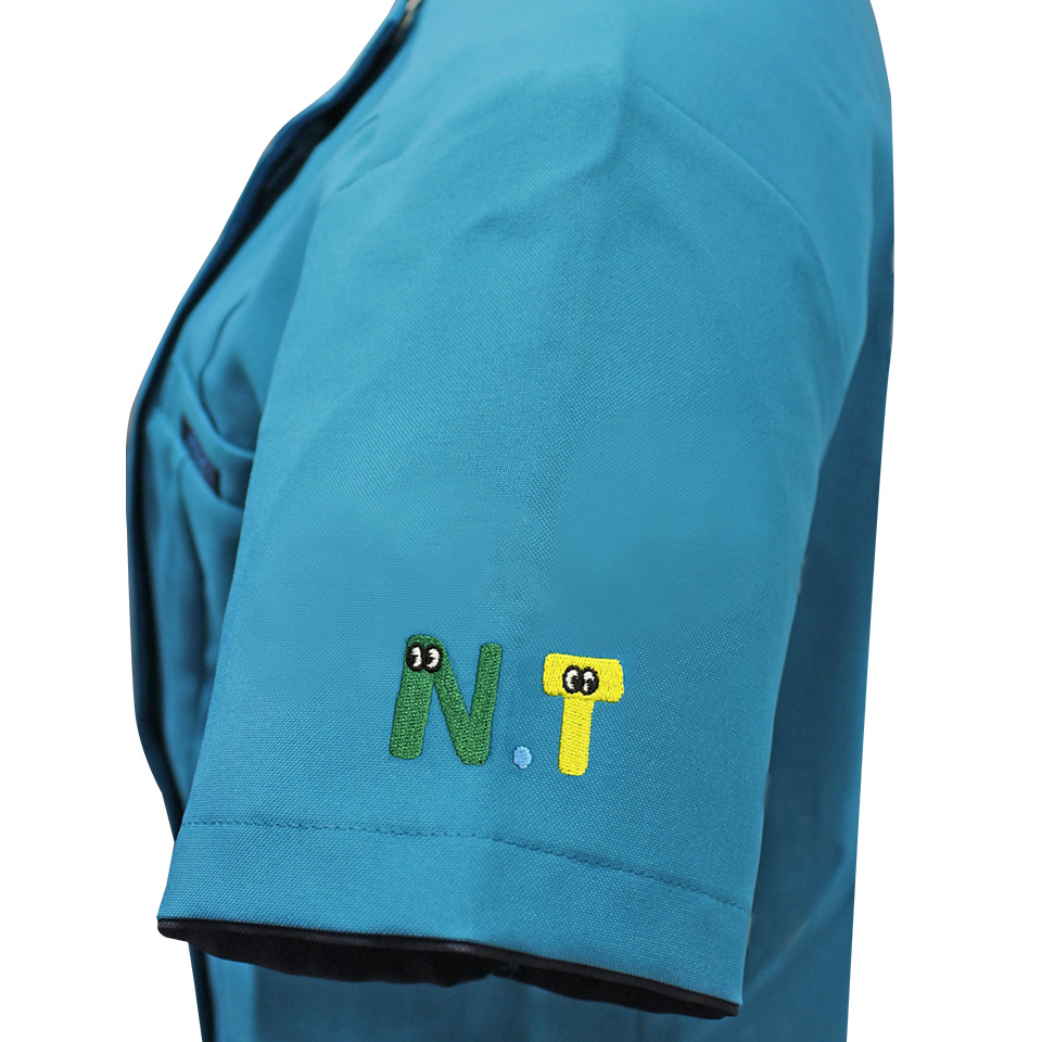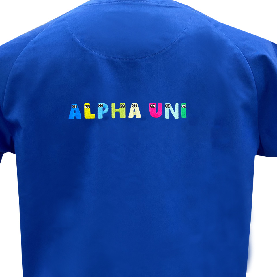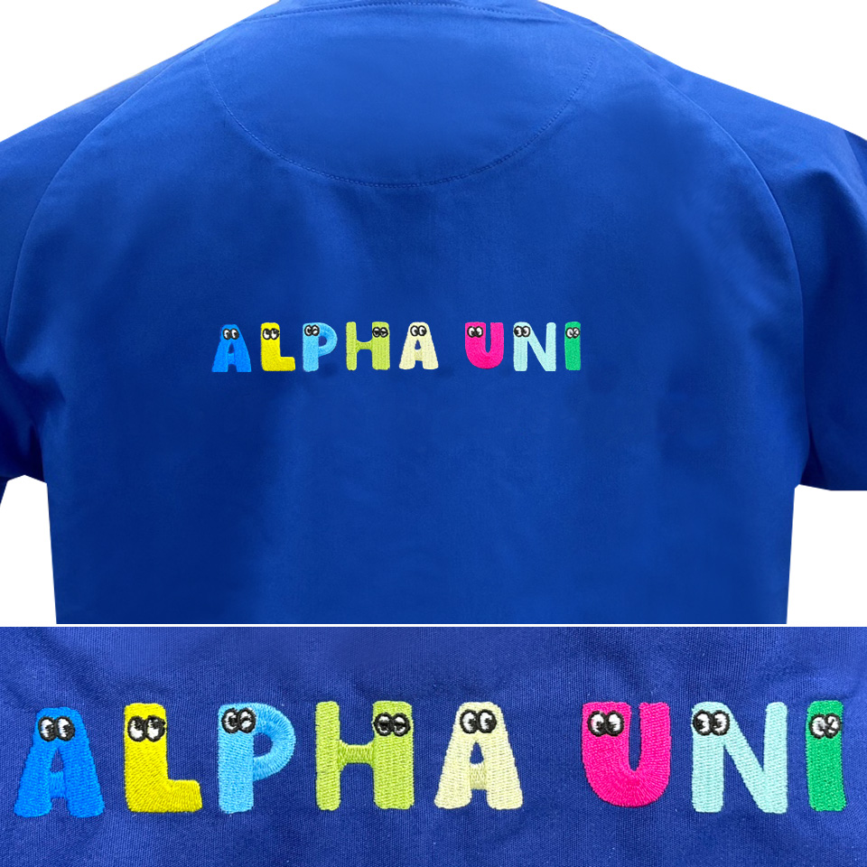 スクラブなどの衣服に刺繍するなら、丈夫で長持ちな「アルファちゃん刺繍」がおすすめ。袖なら、3文字程入れられるのでひと味違ったイニシャル刺繍をいれてみませんか。文字サイズも大きいので背中に刺繍をいれるのもおすすめです。
