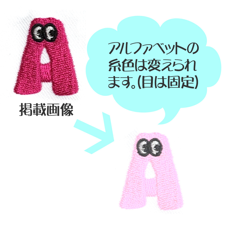 ※直刺繍のみ対応できます。ワッペン加工はできません。目の部分以外のボディ色は糸カラーを自由にお選びいただけます。ネオン色が大人気!アルファちゃんは特色糸代がかかりません。