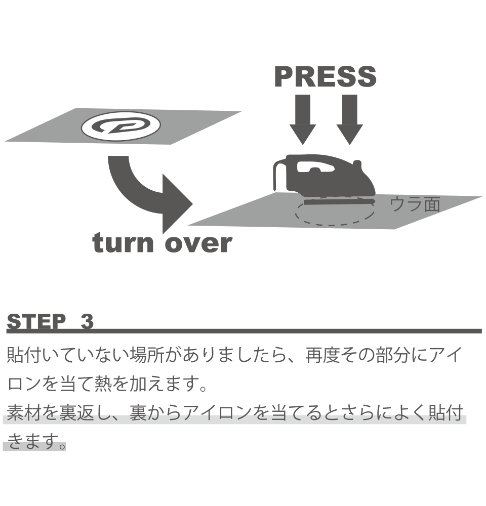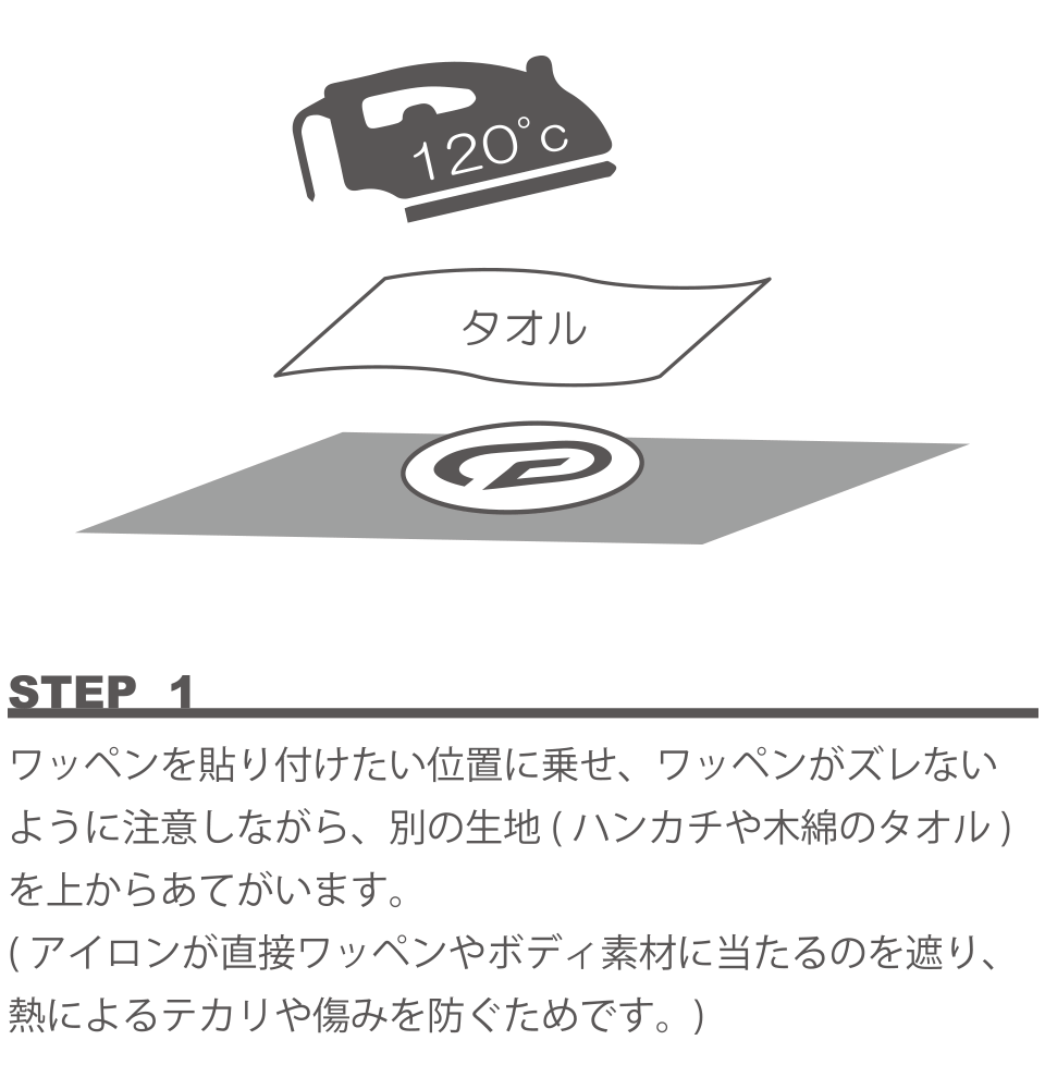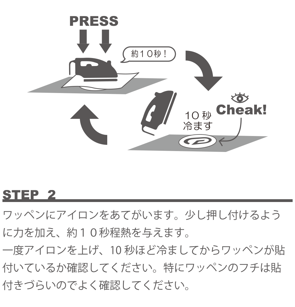 ※ワッペンを貼り付ける際は、なるべく平坦な場所をお選びください。ナイロンなどの熱で溶けてしまう素材には貼付出来ません。念のため、貼り付ける前に生地の端などでお試しください。