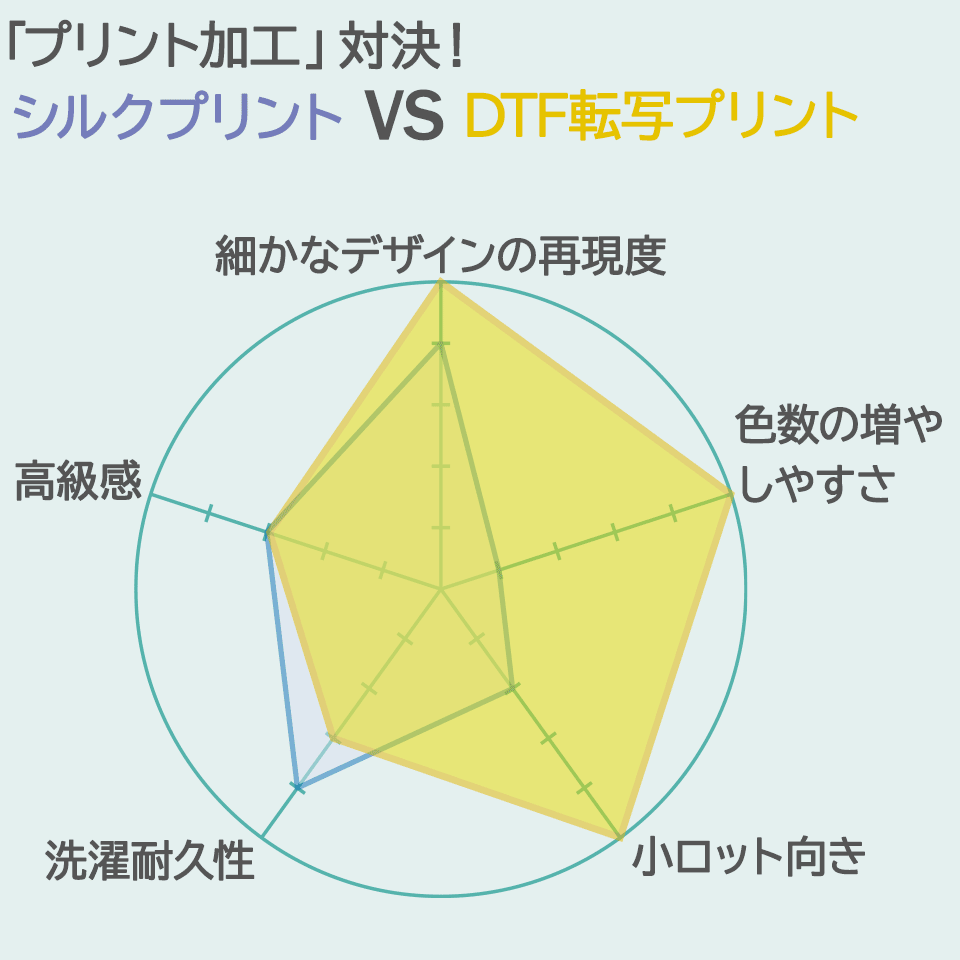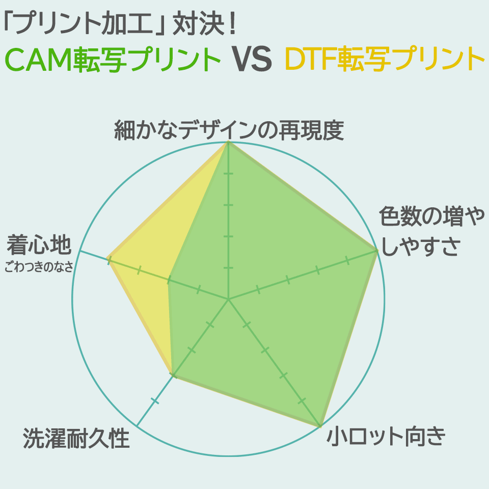 転写プリントは小ロットで複雑なデザインに対応できるが、多少チープな仕上がりに。