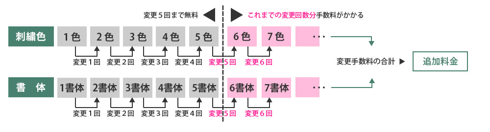5種類を超える場合は、刺繍色・書体それぞれ変更につき550円(税込)の追加料金(変更手数料)が発生します。