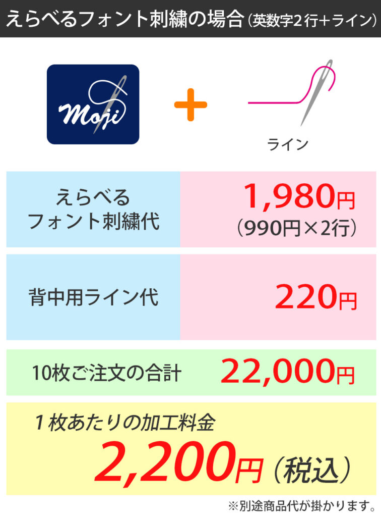 ■6色・6書体使用の場合……刺繍色、書体それぞれの追加料金の合計→2,750円+2,750円=5,500円(税込)