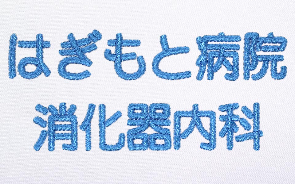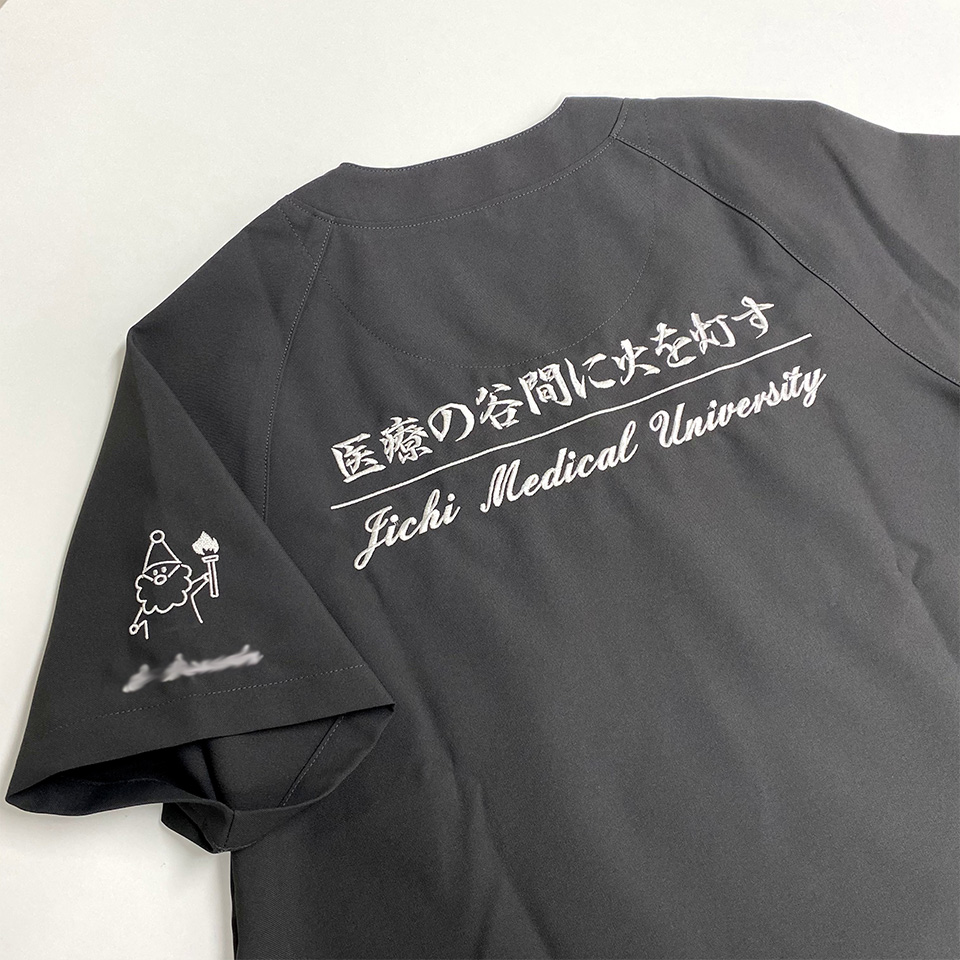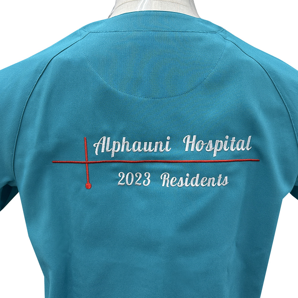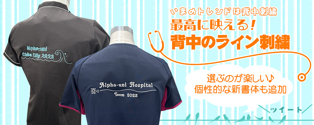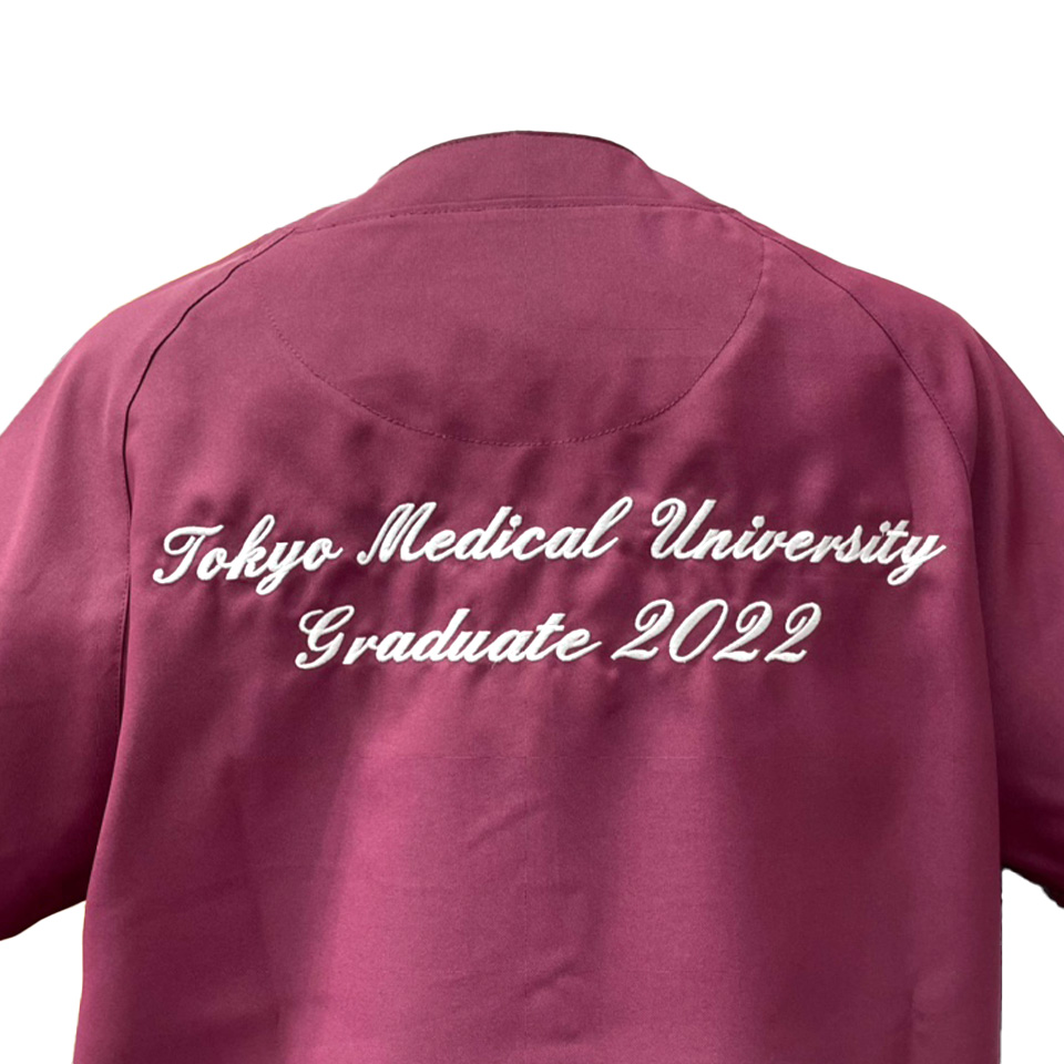 スクラブやウェアの背中に、企業・病院・学校・チーム名称、理念や格言など、自由な文章を刺繍する加工のことです。