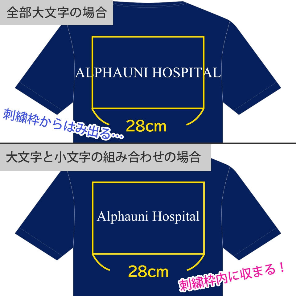 英語の文章では多くの文字を刺繍できるように大文字と小文字の組み合わせをおすすめしております。