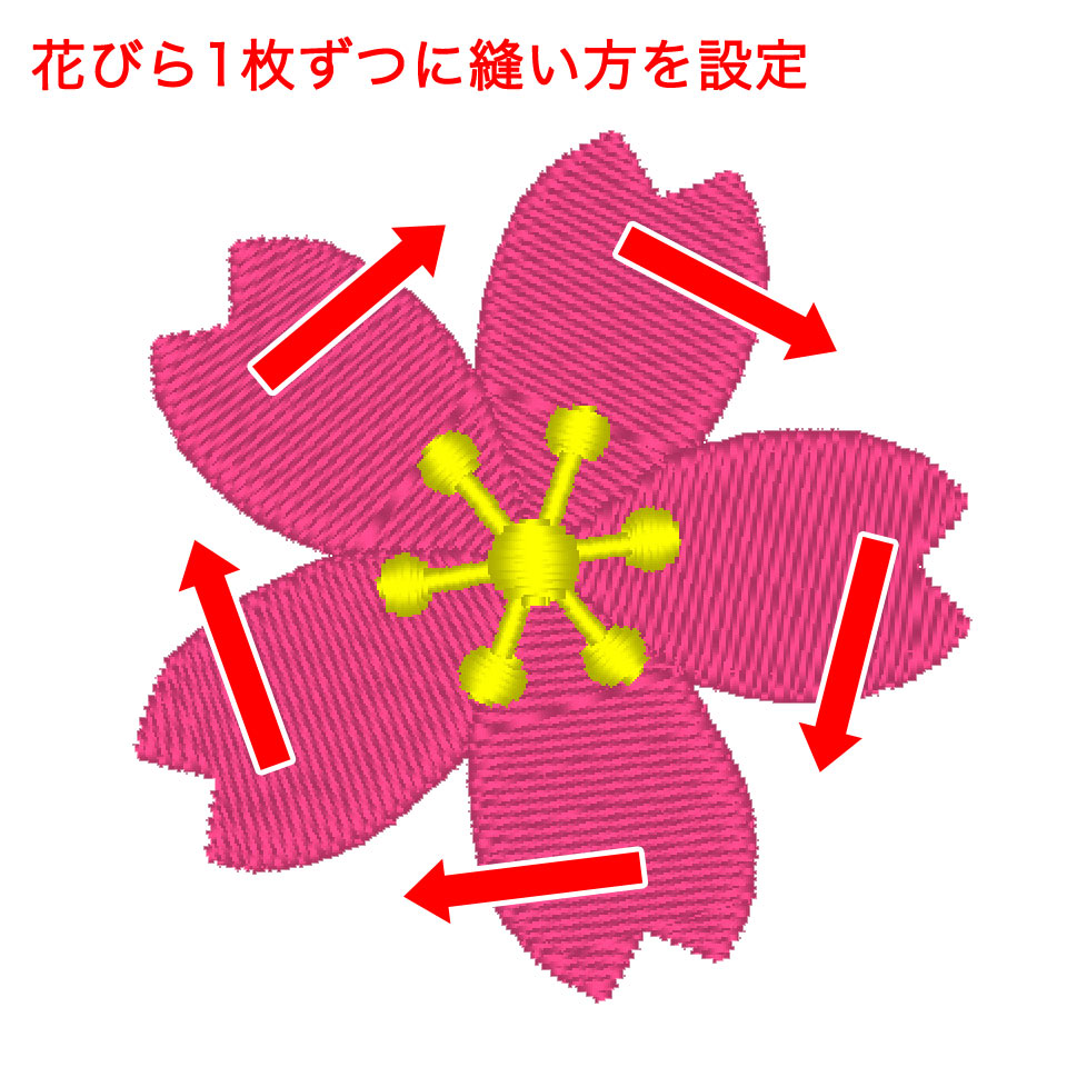 刺繍ソフトが画像を読み込み、縫い方を自動で設定。花びら、花芯を1つの固まりだとソフトが認識しているため、縫う方向がすべて同じになる。