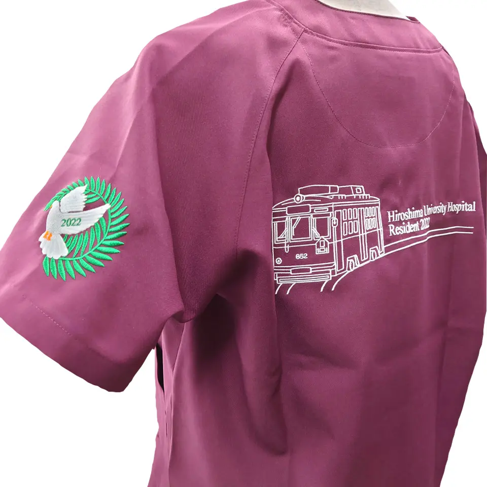 特に背中には大きなサイズの刺繍ができるため、デザインの細部まで表現することが可能です。聴診器など医療関係器具の刺繍も人気ですが、地元の風景や象徴的なものを刺繍で表現することもできます。袖の刺繍と合わせて「もはや芸術作品…!」と思えるようなスクラブになることも…。特別感のあるスクラブに仕上がるため、思い出に残るスクラブを作りたいという方に特におすすめです!