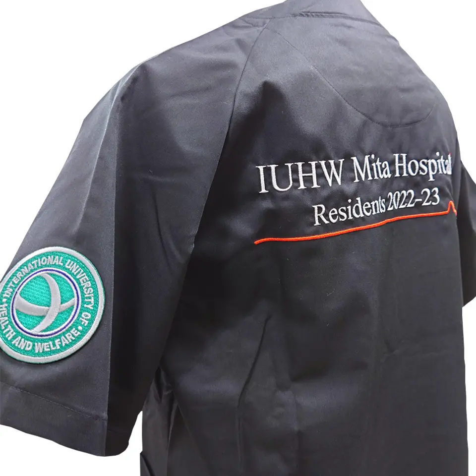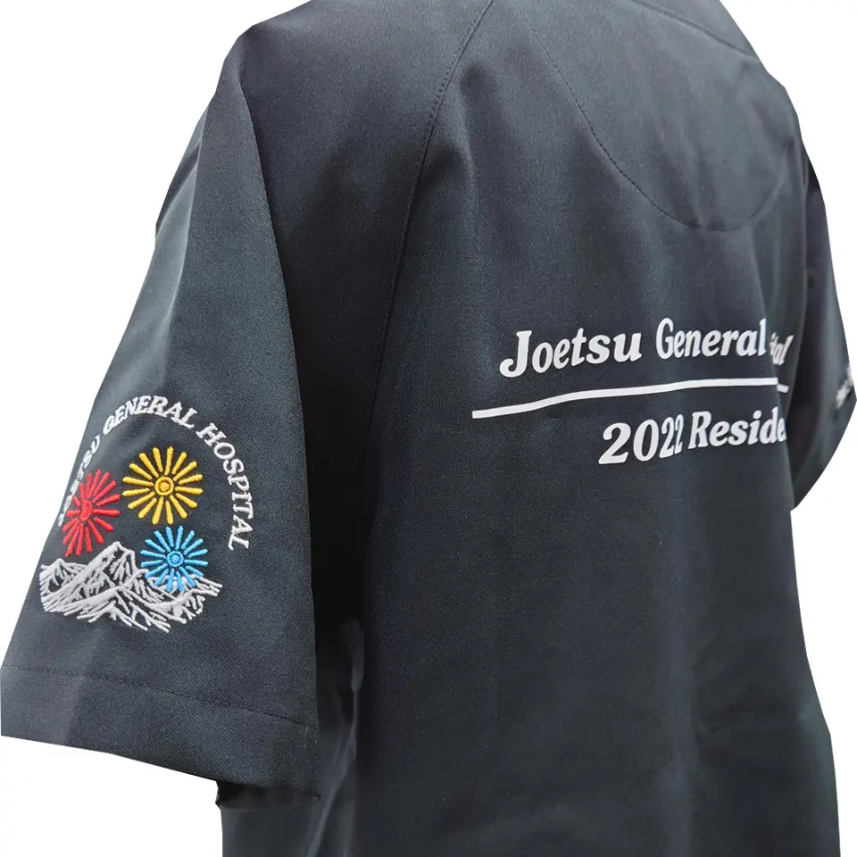 袖にはデザイン刺繍を入れるとより印象に残るスクラブに!病院や大学のロゴを入れれば一体感も高まること間違いありません。