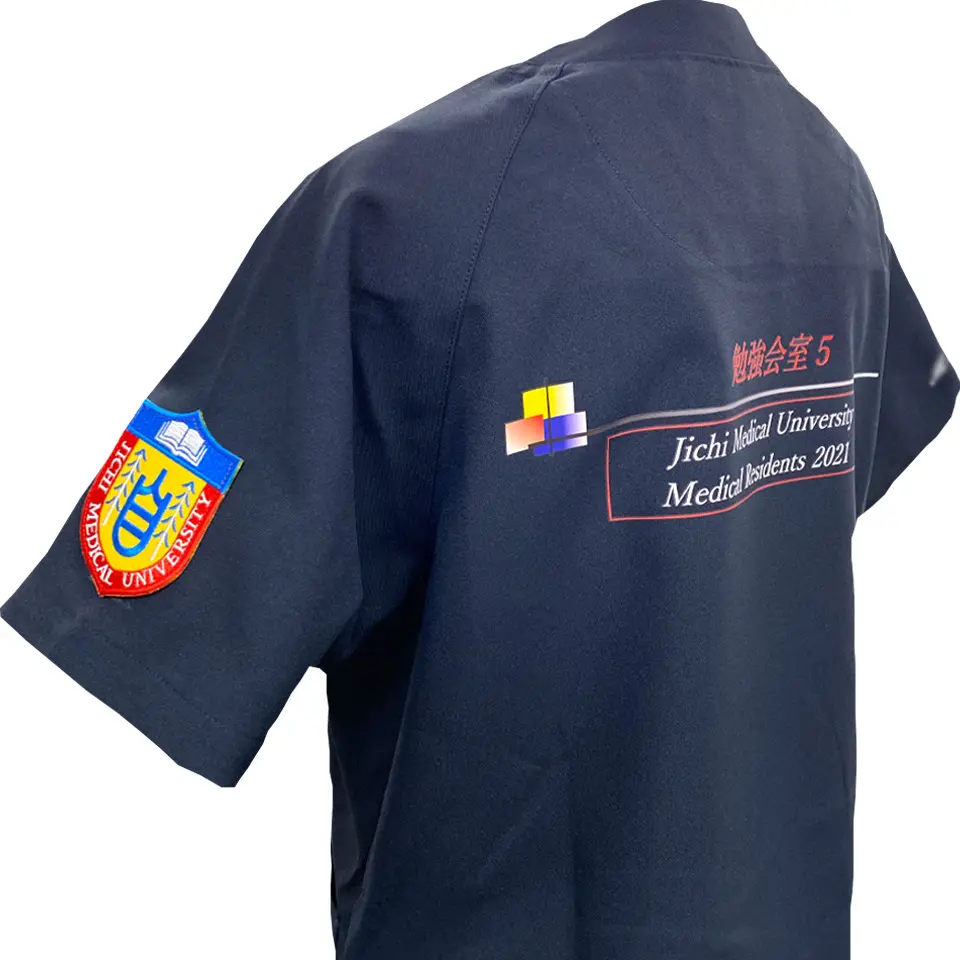 背中のデザイン刺繍と組み合わせて加工するとスクラブ自体の存在感も上がるためおすすめです。