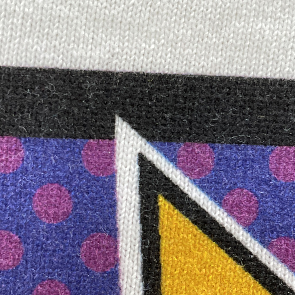 インクを吹きかけてプリントするため、イラストや画像など細かい表現や多色プリントの再現性の精度が高くなります。製品台に生地をセットして、版からインクを落として刷るプリント手法と違い、生地の縫い目やリブなど、凸凹な面に影響されることなく、どこにでもプリントすることができます。ウェア全面にプリントが可能です。また、シートを貼り付ける転写プリントは、生地に馴染みませんが、インクジェットはそのような違和感がないのがメリットです。