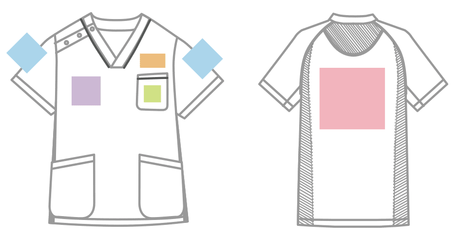 スクラブと白衣・ドクターコートのプリント位置とプリント可能サイズの目安です。