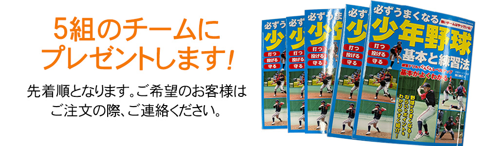 野球のチャンピオンTシャツを税別合計5万円以上お買い上げで京葉ボーイズの関⼝勝⼰監督の著書「必ずうまくなる少年野球基本と練習法(コスミック出版)」の本を5組のチームにプレゼントします!関⼝勝⼰様は弊社の代表が懇意にしており、ぜひ、お客様に読んでいただきたいという思いでプレゼント企画を実施しました。少年野球の技術・練習法がわかりやすく紹介されています。先着順でのプレゼントとなります。希望されるお客様はお早めにご連絡ください。